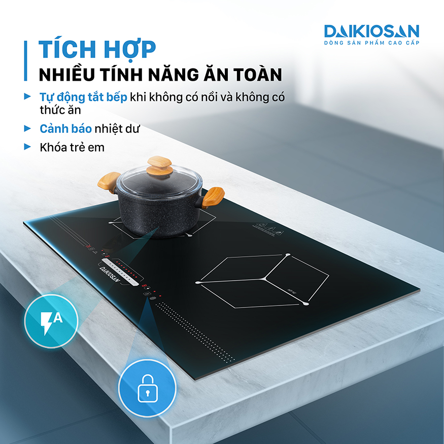 Vì vậy, bếp từ Daikiosan DKT -200002 được tích hợp với tính năng tự động tắt bếp nếu trên vùng nấu không nồi hay không có thức ăn trong nồi. Nhờ vậy mà bạn sẽ không phải lo đến vấn đề tốn kém điện năng hay mất an toàn.