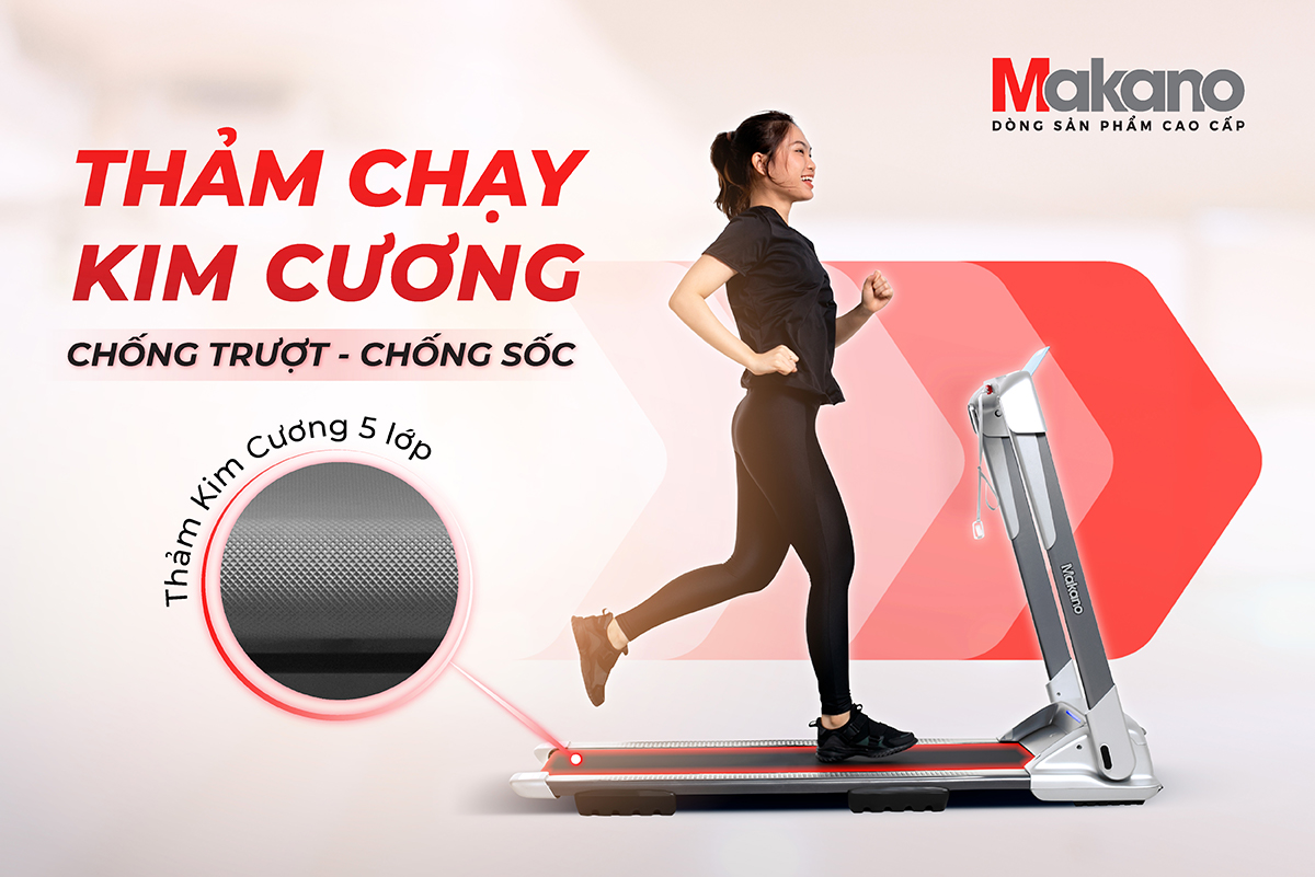 Thảm chạy mà máy chạy bộ đơn năng Makano DVCB-00006 được trang bị là thảm kim cương với độ ma sát tốt, chống trơn trượt, vững chắc và độ bền vượt trội theo thời gian.